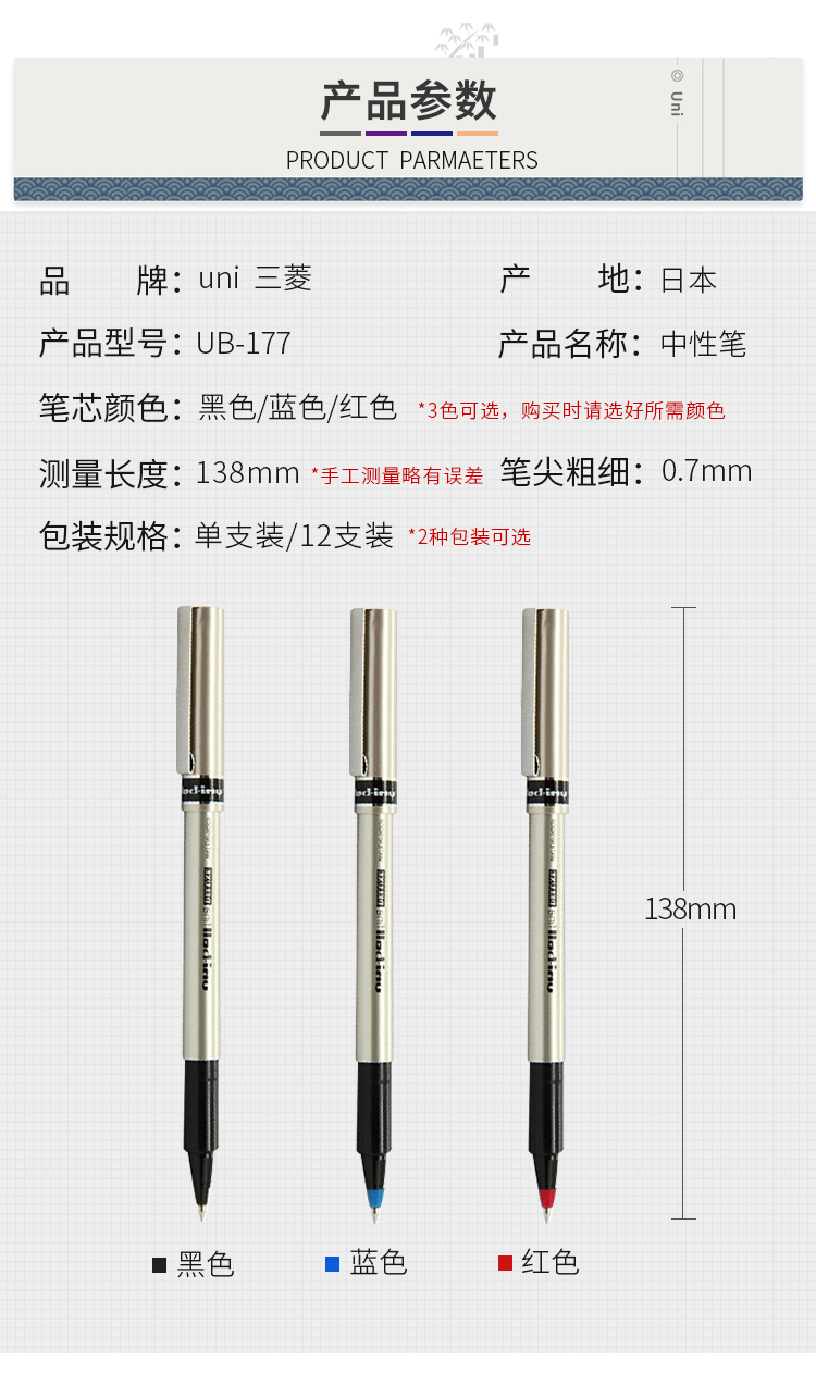• 商品名称:三菱/uni UB-177黑色单支 普通中性笔 0.7mm 黑色