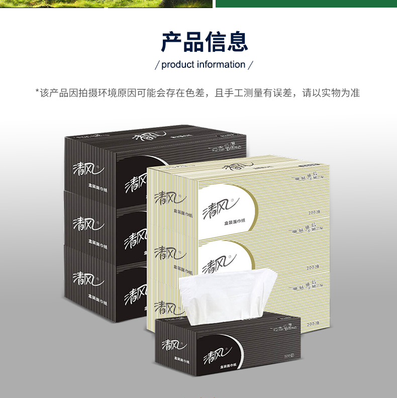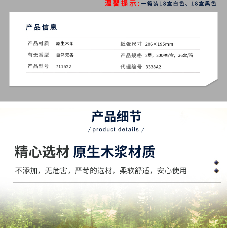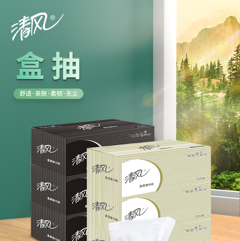 • 商品名称:清风/APP B338A2 黑白 195mmx206mm*2层 抽纸 200抽/盒 36盒/箱