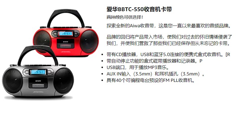 商品名称: 爱华/aiwa 磁带卡带录音CD机播放器 蓝牙收音机便携音响 BBTC-550