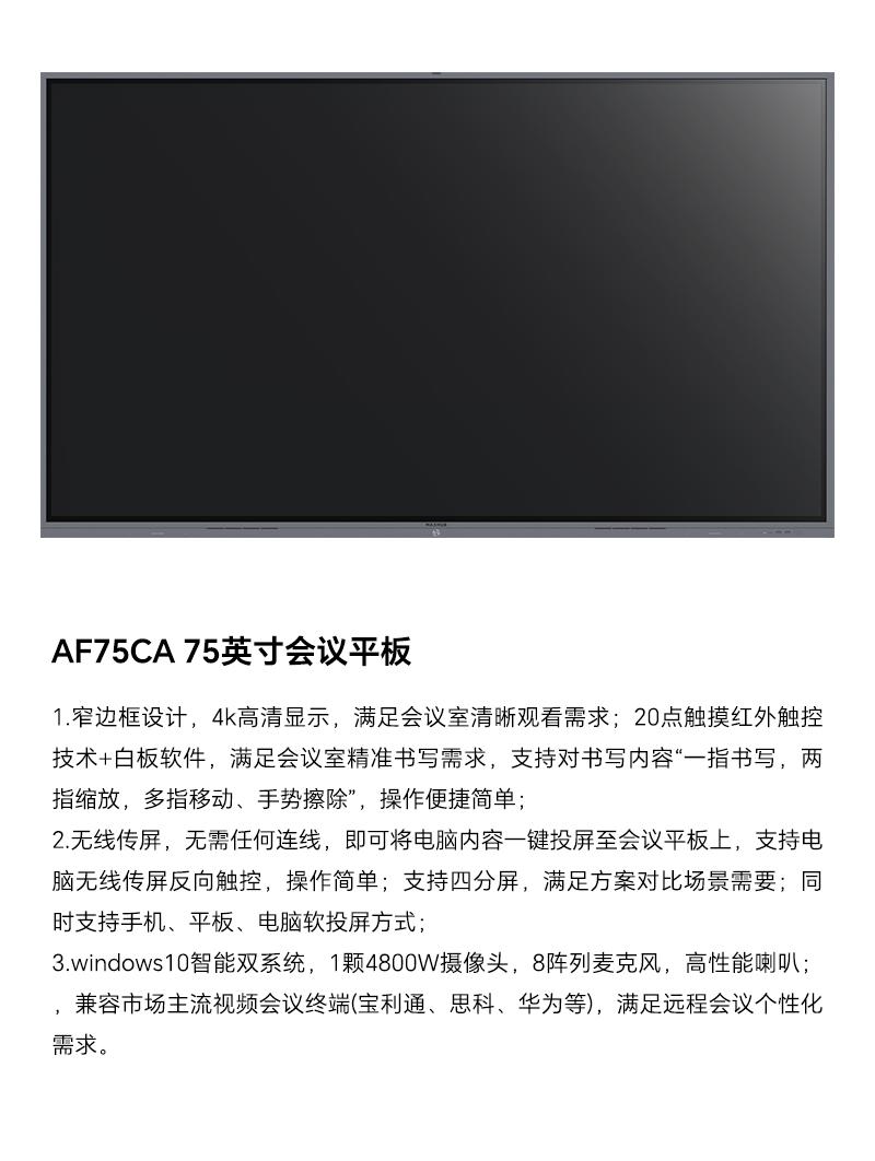 办公设备  > 办公设备(A0202)  > 电子白板(A020206)  >  国产  >  国产 AF75CA 75英寸会议平板