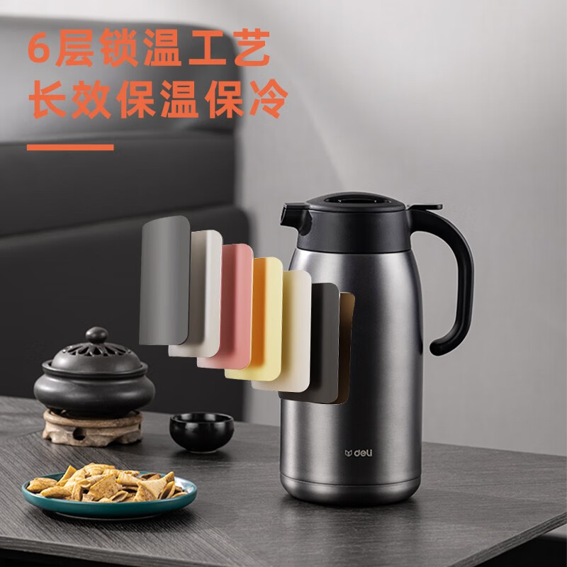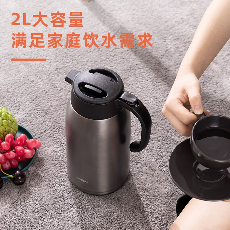 • 商品名称:得力/deli LL100 2L真空不锈钢办公家用保温壶 深灰